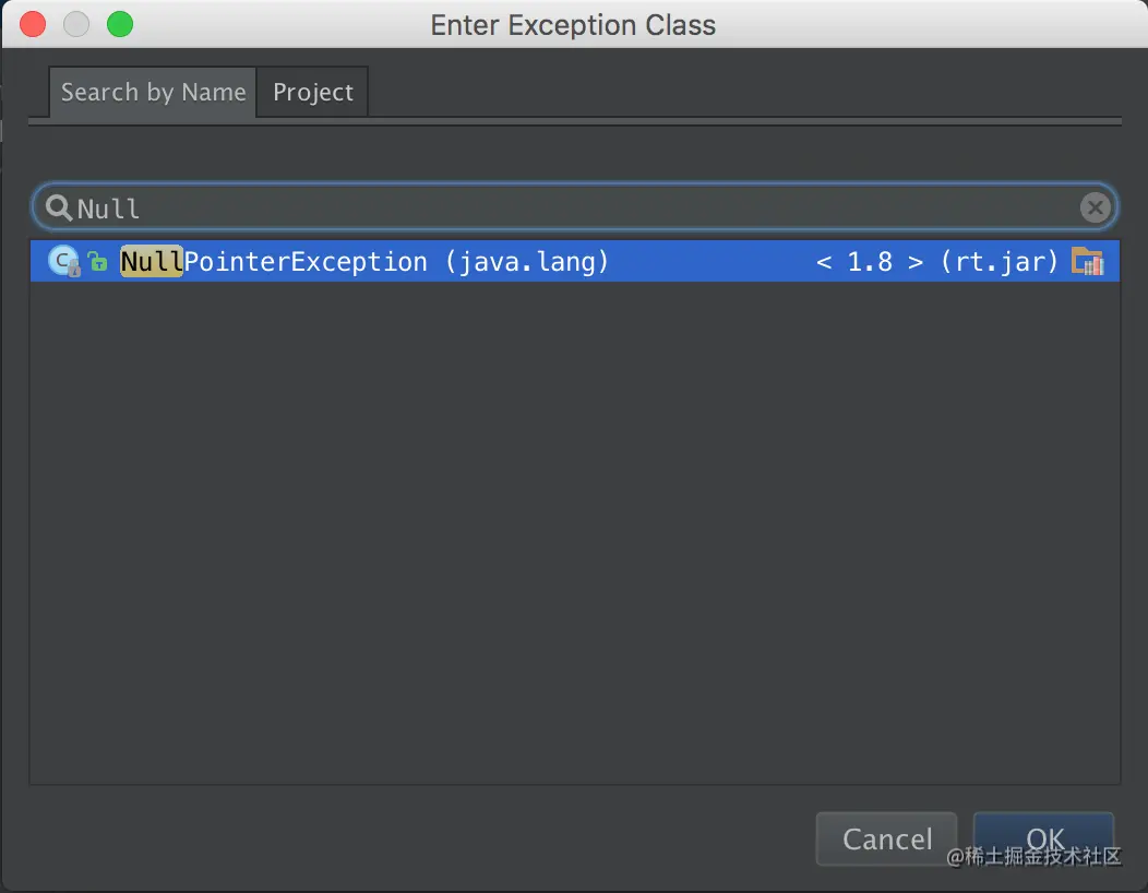 打开断点管理器,这里有两种方式打开:点击工具栏菜单Run,选择View Breakpoints;在Debug窗口直接点击View Breakpoints图标。点击左上角加号按钮,可以添加各种断点,包括前文提到的Method Breakpoints和Field Watchpoints断点,这里我们选择Exception Breakpoints异常断点,在弹出的Enter Exception Class窗口中输入需要监控的异常类别即可: