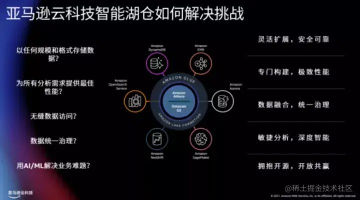 回到文章开篇提到的问题,目前行业内已经形成了数据湖和数据仓库的融合必将降低大数据分析成本的共识,主要分歧点在于数据湖、数据仓库对存储系统访问、权限管理等方面的把控。在这些方面,亚马逊云科技的“智能湖仓”架构围绕这些问题都提供了相关的工具或服务。