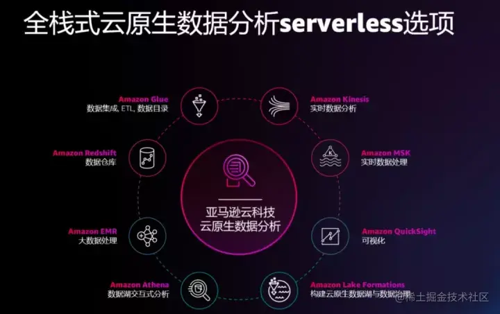 为了让构建方式更敏捷,在 2021 亚马逊云科技 re:Invent 大会上,亚马逊云科技宣布推出更多数据分析服务的无服务器版,借助无服务器的能力,让用户可以更敏捷地构建自己的数据存储、分析、智能应用解决方案。