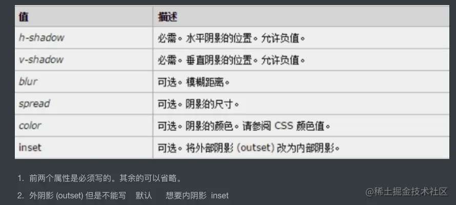| 上边框 | border-top-style:样式; border-top-width:宽度;border-top-color:颜色;border-top:宽度 样式 颜色; | |