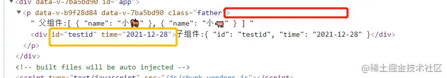 在父组件上写 inheritAttrs: false,则父组件的根元素上不会显示,孙子组件还会显示,这样对比明显,如下图