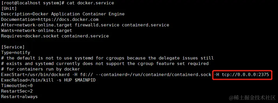 ExecStart=/usr/bin/dockerd -H fd:// --containerd=/run/containerd/containerd.sock -H tcp://0.0.0.0:2375