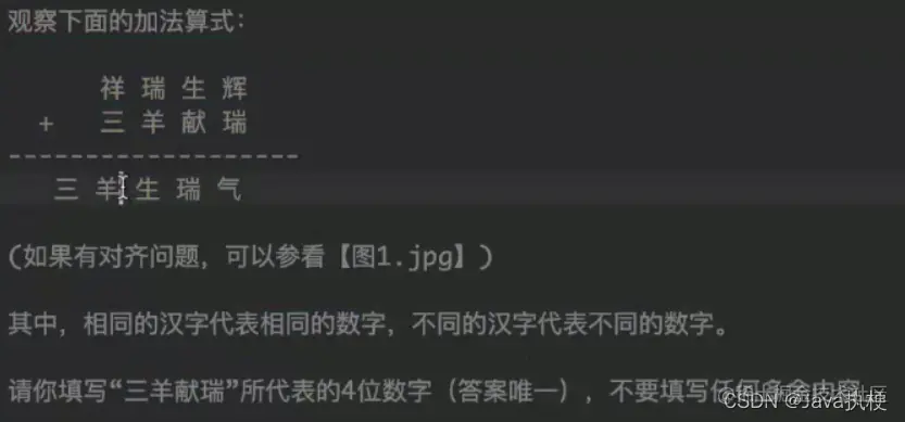 🔑解析:这是一道非常非常经典的蓝桥真题枚举问题。最直接最暴力的方法就直接去写七个for循环分别将祥瑞生辉三羊献七个字枚举出来,再写一个判断答案是否符合要求的方法。思路很简单,但是步骤写起来需要小心。但其实这里我想说的是这里其实是可以优化的,两个四位数相加得到一个五位数。那么这个这个五位数的万位只可能是1,也就是三字其实就是1,既然祥加三得进位,三又是1,那么祥肯定就只能是9,进而再可得羊是0。大家可以和上面我贴出的答案对比就能看出来。这样其实我们的循环就少了几层了,但蓝桥杯做出答案才是目的,即使是7个for循环,但其实都是常数级的循环,瞬间就可以枚举出结果。