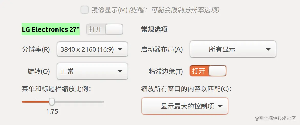 这里调节的话基本上能够解决90%软件的缩放问题,但是还是有很多软件不生效,比如QT开发的、Wine下的软件,这里推荐大家看一下我以前总结的文章:Ubuntu 4K显示器缩放设置