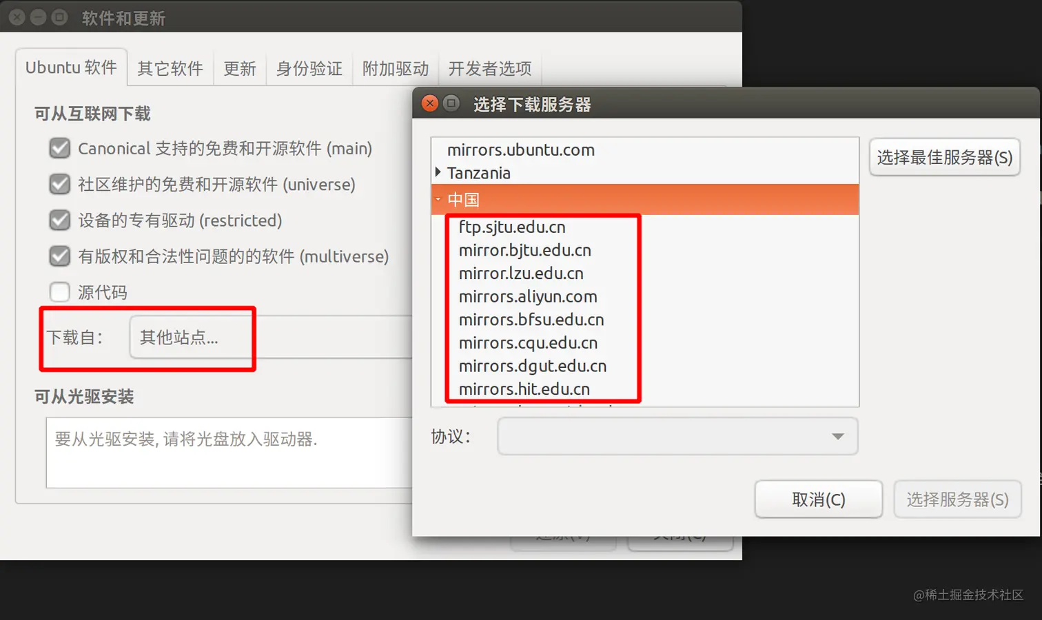 网上有很多教程是直接修改source文件的,比较麻烦,而且容易出错,这里告诉大家一起最简单的方式,打开软件和更新设置,里面有一个选择更新源的选项,选择其它源就可以看到国内的所有认证过的第三方源,mirrors开头的都是,选择一个就行,也可以点击右边的按钮,自动选择的一个最快的源。