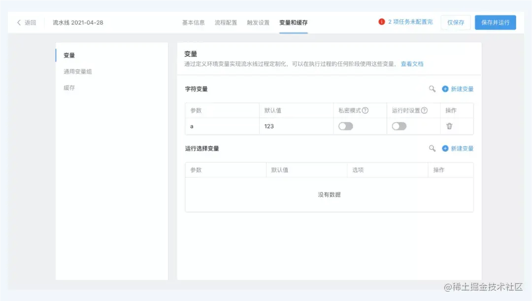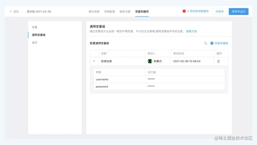 流水线管理者,只需要在流水线中关联变量组,就可在流水线任务中使用该变量。
