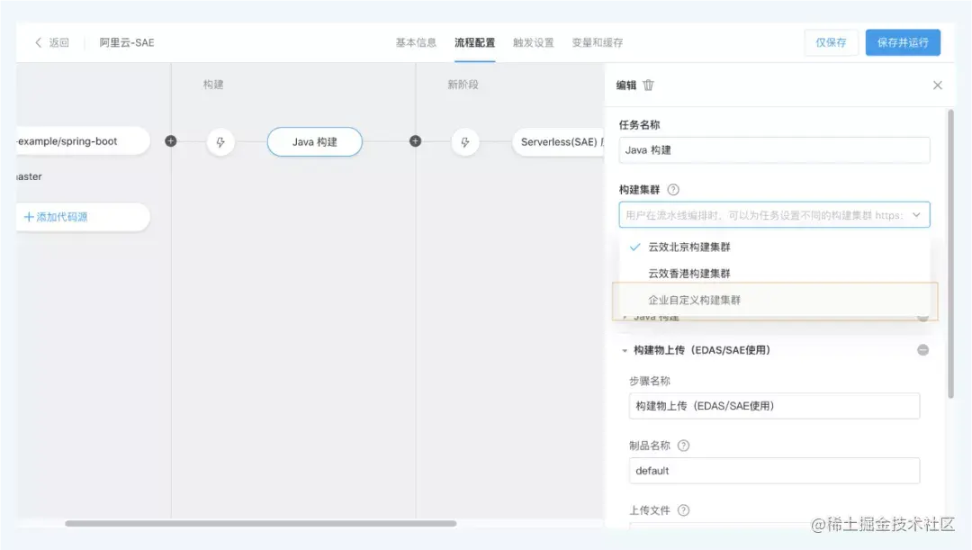 在流水线的任务节点中,可以选择企业自定义的构建集群执行构建任务。