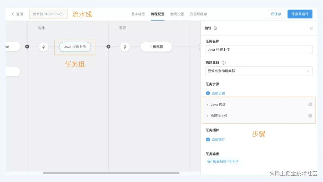 **4、流程编排:**通过对不同工具和任务的流程编排能力,实现不同 CI/CD 流程把控。通常来说,流水线工具不但支持串联自身提供的测试、构建、部署功能,还会支持企业打通自有的其他工具(比如 git 仓库、自动化测试系统等)。