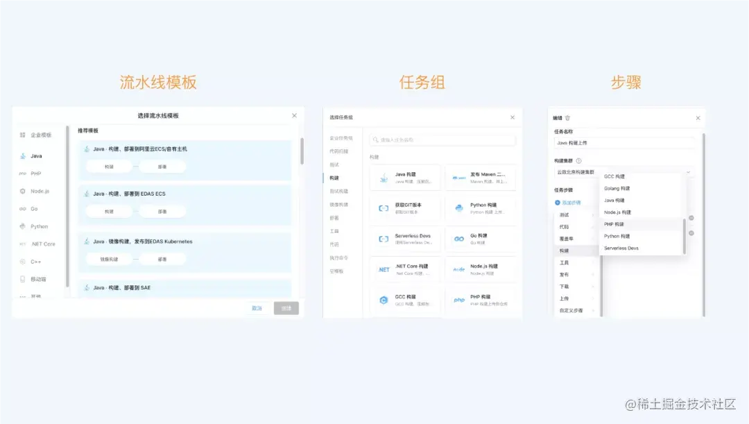 为了方便用户快速创建流水线,云效流水线 Flow 预置了部分流水线模板、任务组、步骤。