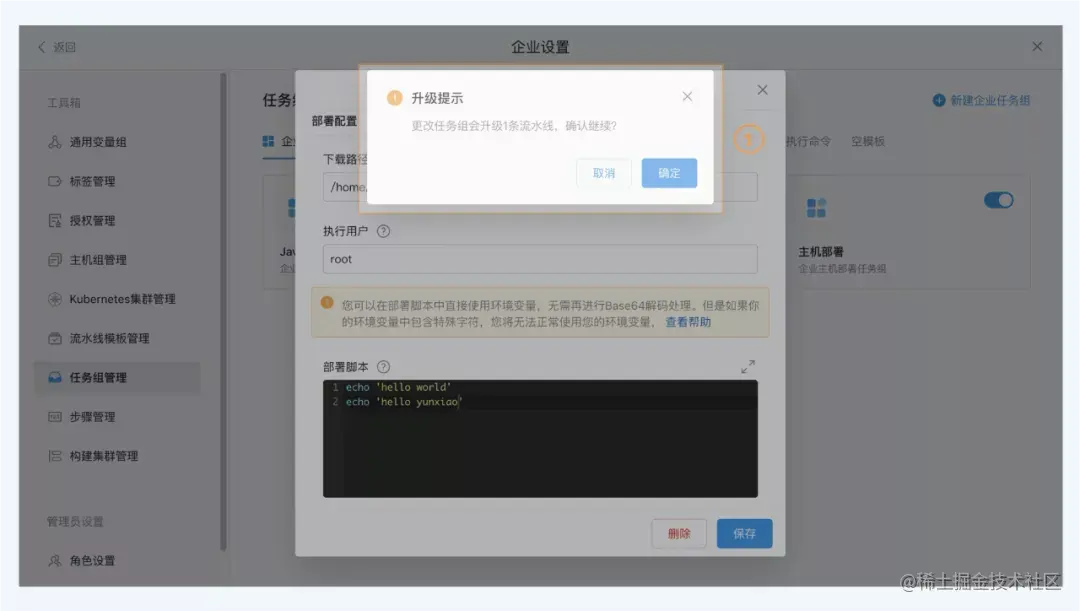 企业成员在配置流水线过程中,可以选择已经创建的任务组。此后,企业管理员编辑修改任务组后,会对关联流水线中的任务节点进行升级。