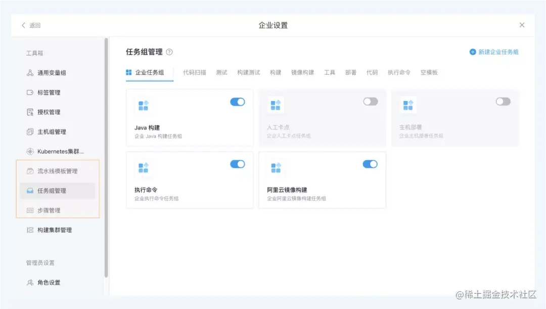 此外,在流水线模板管理-任务组管理-步骤管理中,企业管理员可以关闭企业不需要的内容以避免造成干扰。