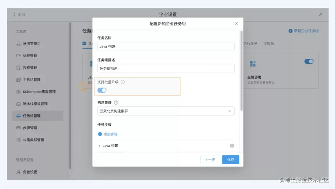 支持在企业设置中添加任务组时,开启“支持批量升级”功能。