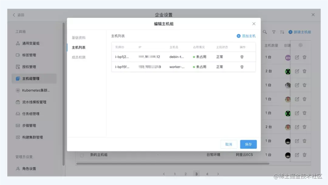 支持在企业设置中添加主机组,主机组可选择阿里云 ECS 和自有主机两种类型。每个主机组下均可添加多台主机资源,同时可将企业成员设置为主机组成员,拥有权限的成员才可以在流水线中选择该主机组资源。