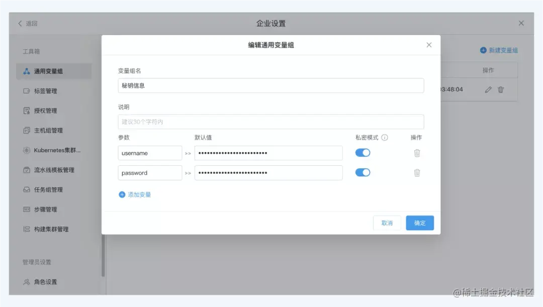 支持在企业设置中添加变量组,每个变量组可设置多个变量,且变量均可设置为私密变量,部分敏感参数,如 username、password 等,设置成私密变量后,可以大幅降低安全风险。