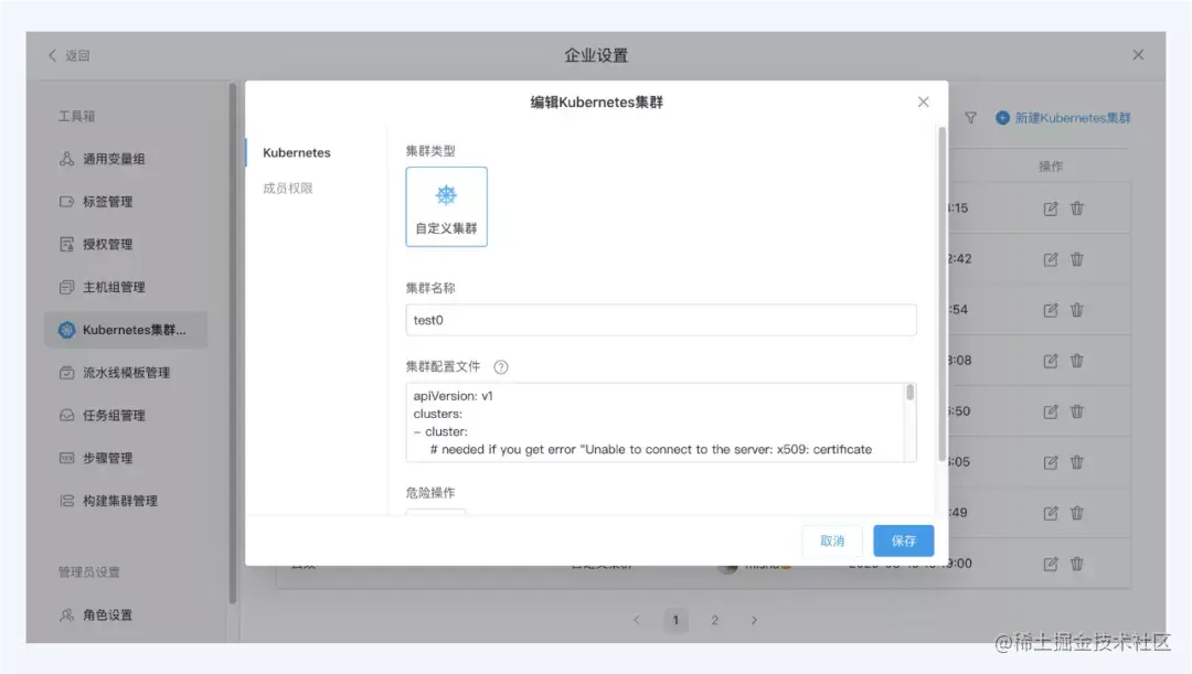 同样,支持在企业设置中添加 Kubernetes 集群,主机组可选择阿里云容器服务 Kubernetes(ACK) 和自定义集群两种类型。可将企业成员设置为集群成员,拥有权限的成员才可以在流水线中选择该集群资源。