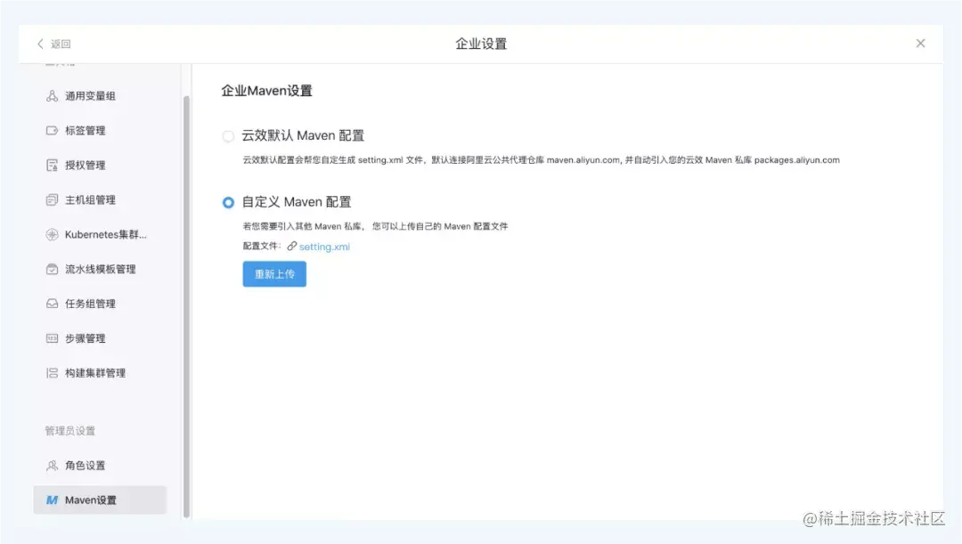 因此,云效提供了企业 Maven 配置功能,支持在企业设置中上传自定义 settings.xml 文件,Flow 会根据你的配置执行 Java 构建任务。