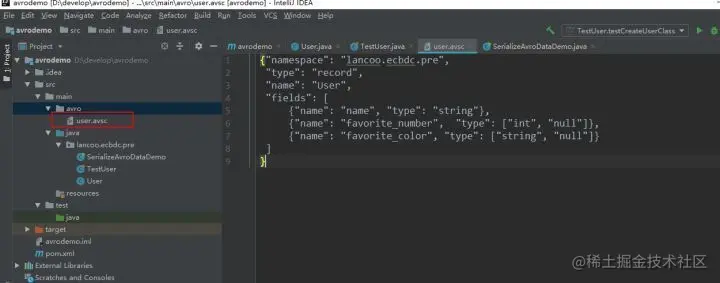 使用JSON为Avro定义schema。schema由基本类型(null,boolean, int, long, float, double, bytes 和string)和复杂类型(record, enum, array, map, union, 和fixed)组成。例如,以下定义一个user的schema,在main目录下创建一个avro目录,然后在avro目录下新建文件 user.avsc :