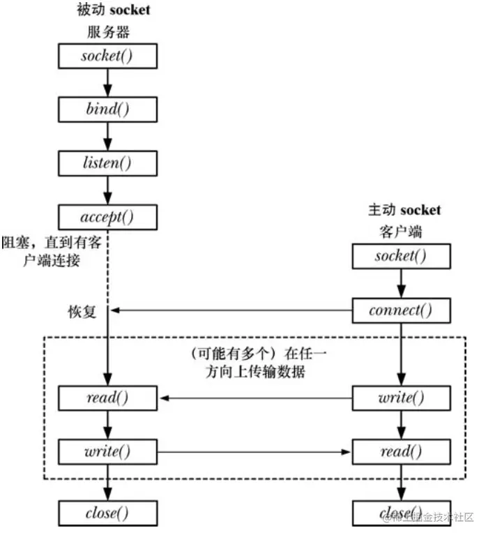 关键:accept又会创建一个新socket (有别于socket调用返回的socket:监听socket和连接socket)