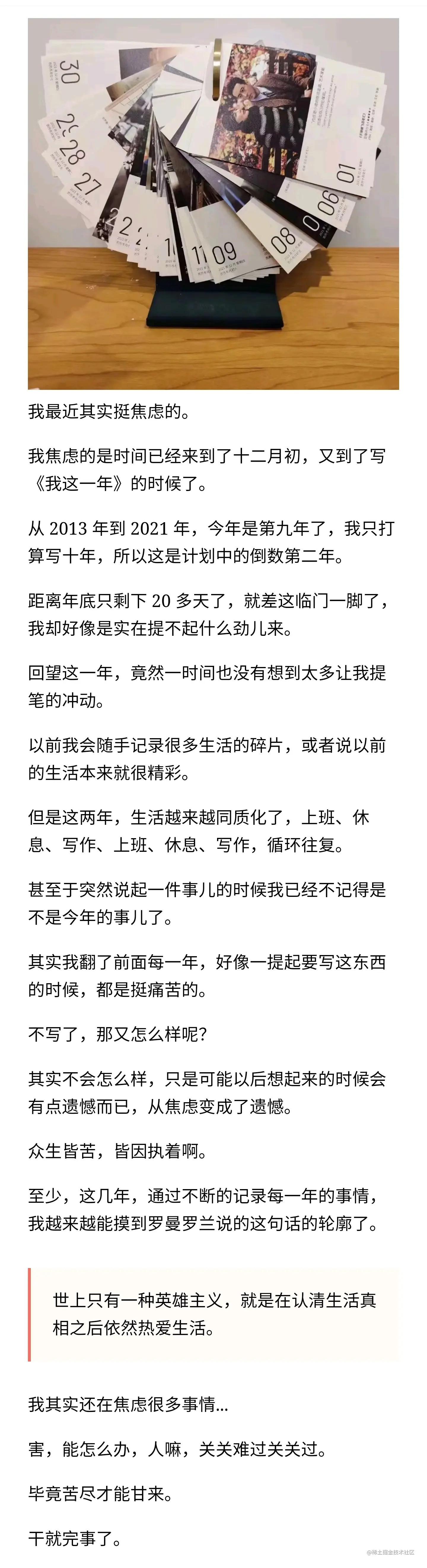 剩下的一次“焦虑”就是我在写《我这一年》之前,觉得今年好像也没啥写的,觉得今年可能写不完了,十年之约有中断的可能性,让我焦虑。