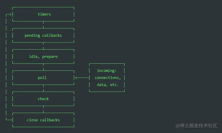 nodeJs的事件循环其实大致思路跟在浏览器上的是相似的,但nodeJs对不同的宏任务又作出了不同时期的区分。下面是官方的流程图: