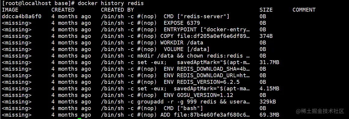 我们可以通过 docker image history命令来查看镜像分层情况,以redis为例