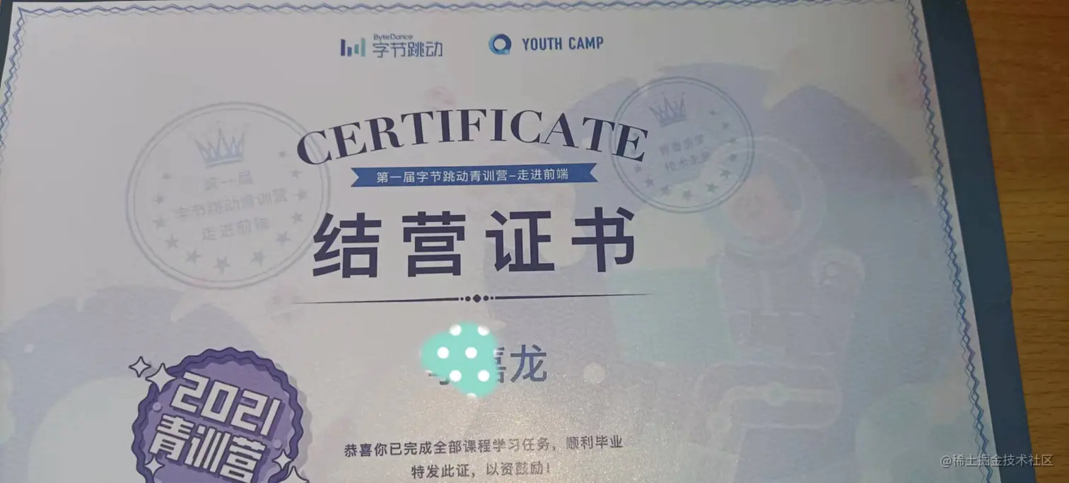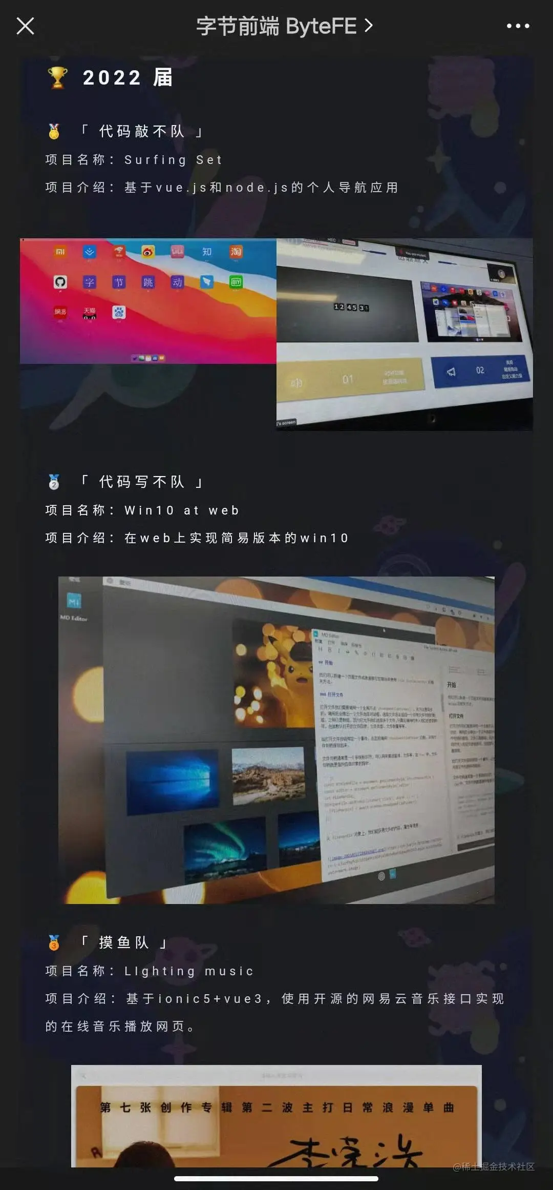7月底在掘金冲浪时看到了字节举办的前端青训营,果断报名了,通过笔试进入到了进阶班。在这里认识到了一群能力强、志同道和的小伙伴,以及导师字节WebInfra大佬 YCaptain,在伙伴们的共同努力以及导师的指导下,我们「代码写不队」获得了项目评比的第二名: