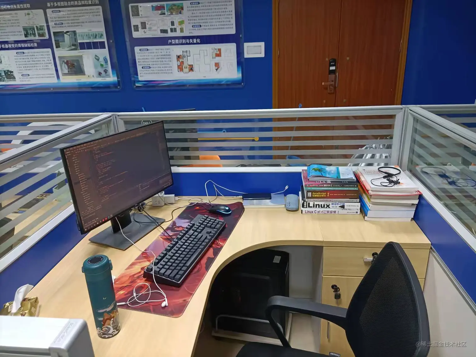 2021年开学的时候正值大三下学期,很多人都面临着工作还是考研的选择,一开始的计划也是考研,为此也开始了准备,看朱伟的恋练有词,田静、刘晓燕的语法书,在力扣上刷题等。开学后除了上课,就是在实验室中搞项目。放张实验室的工位。