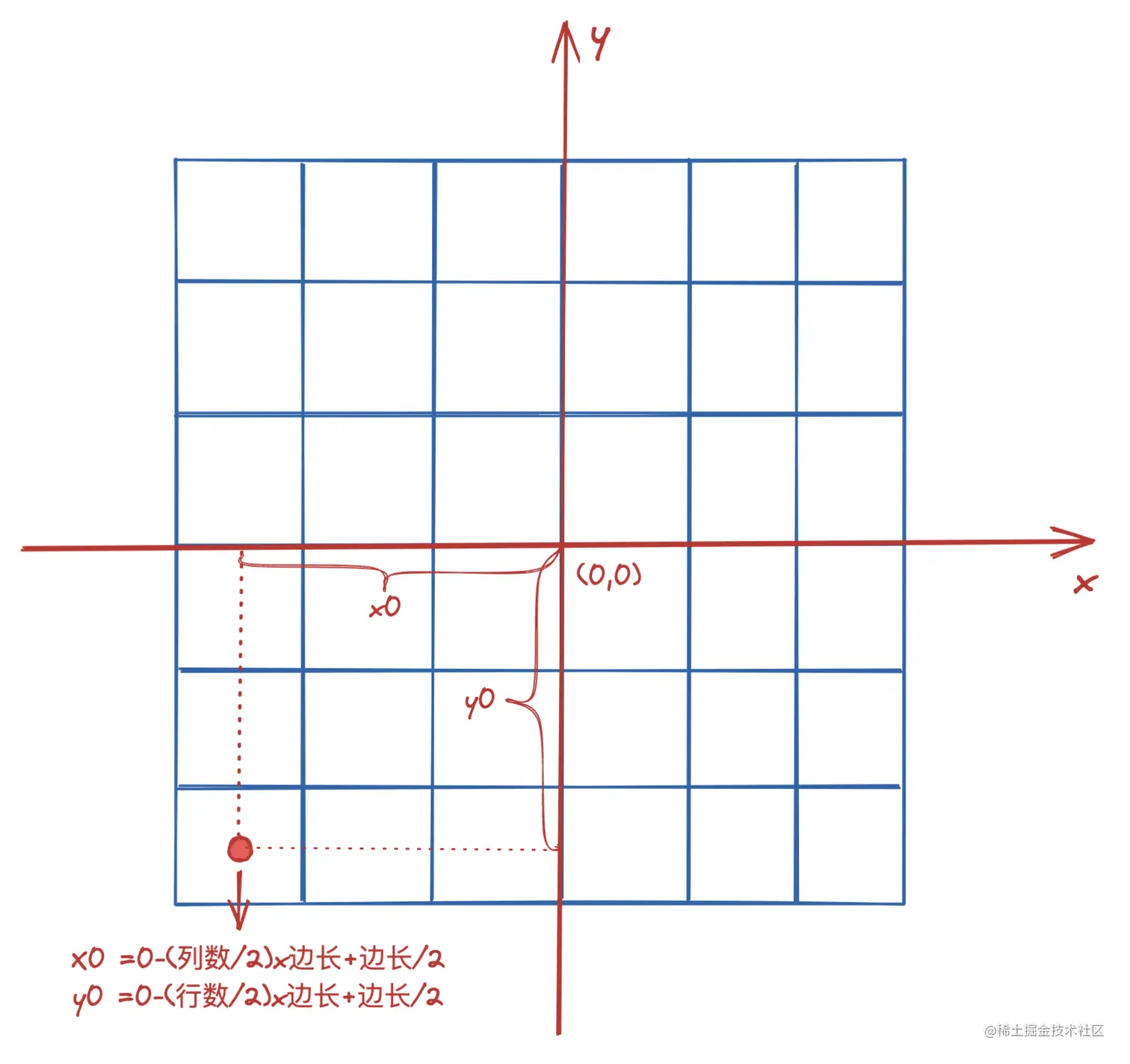 x0 = 0-(列数/2)*边长+边长/2
