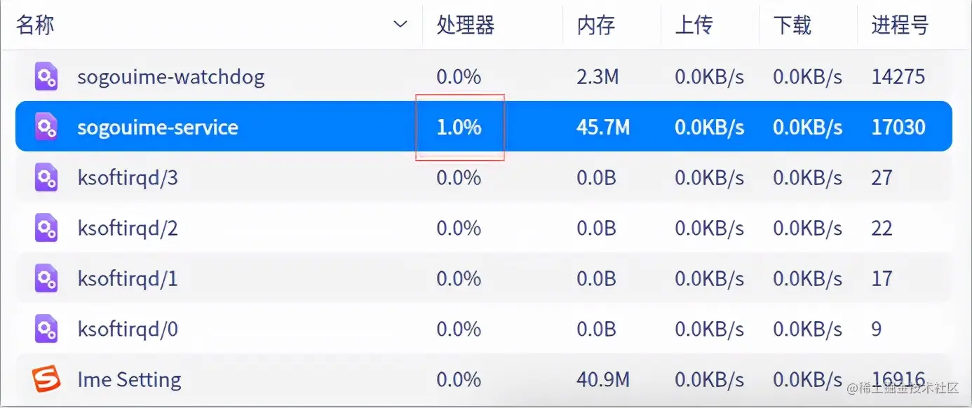 最近在搞Linux下性能评测,在做CPU评测时发现了个有意思的现象,因为uos系统是自带系统监视器的,在对输入法进程检测时,发现其CPU占用率为1%: