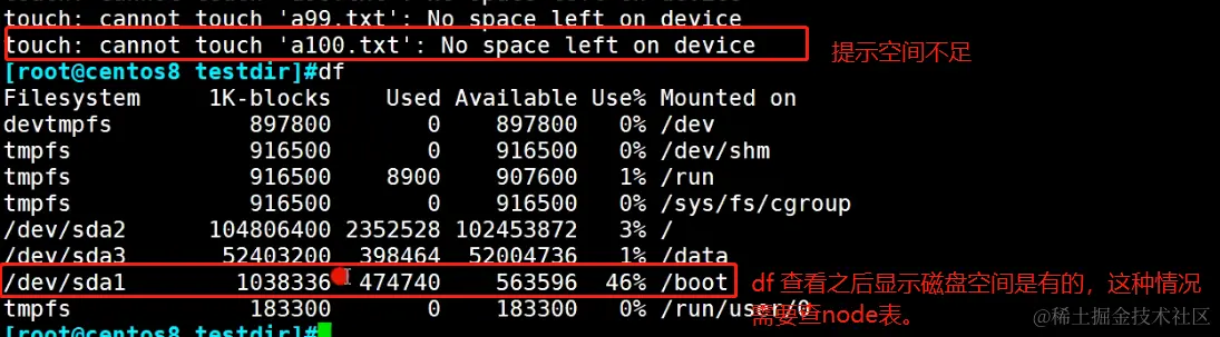 案例1:df -h 显示磁盘还有空间,可是 创建文件的时候提示No space left on device (设备上没有剩余空间),为什么