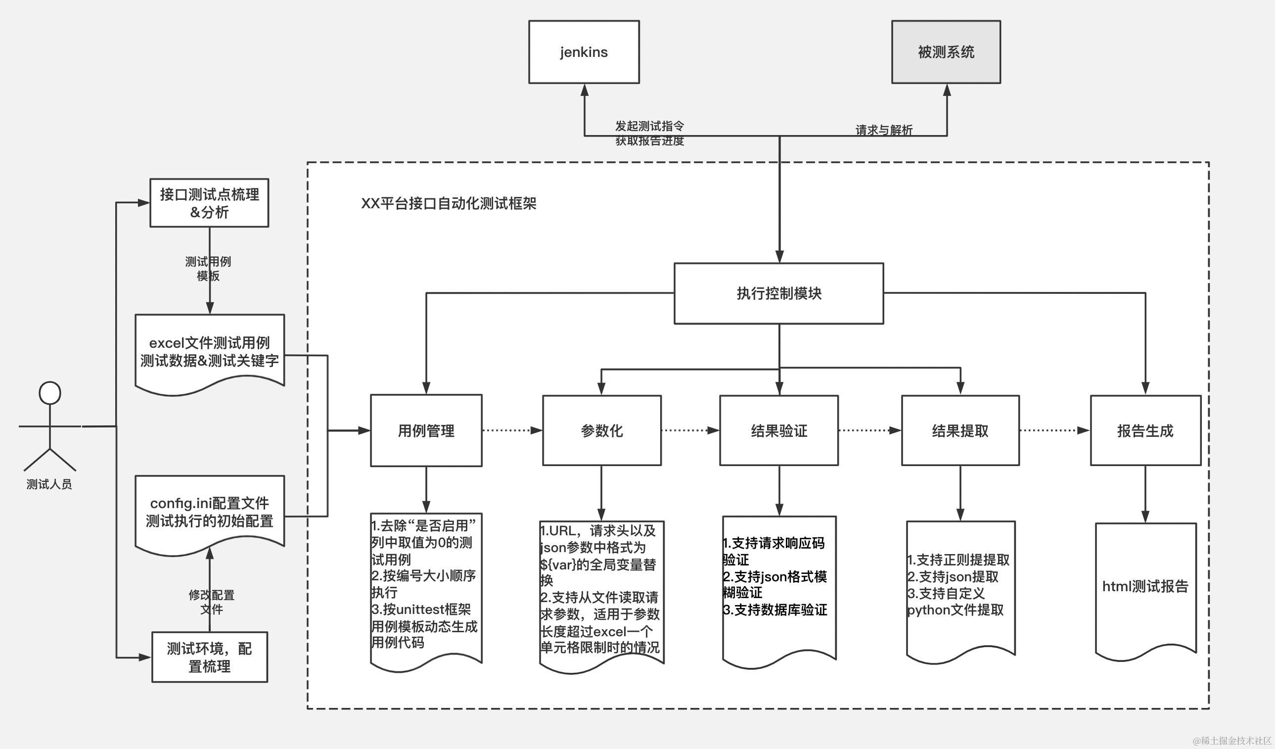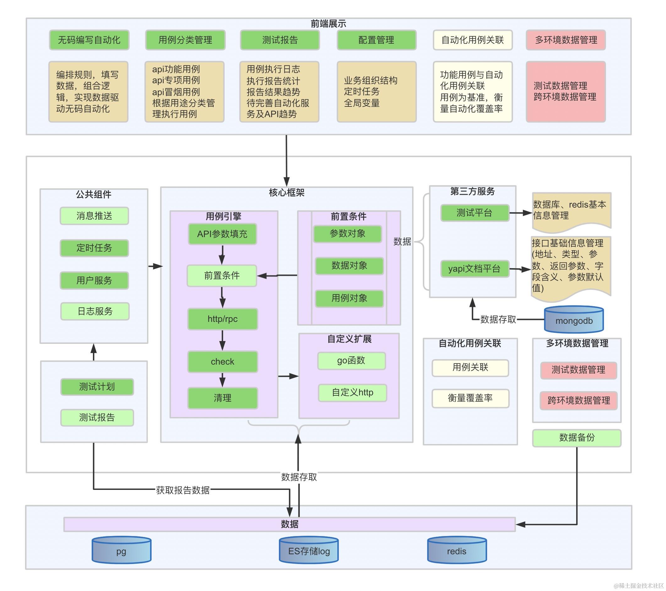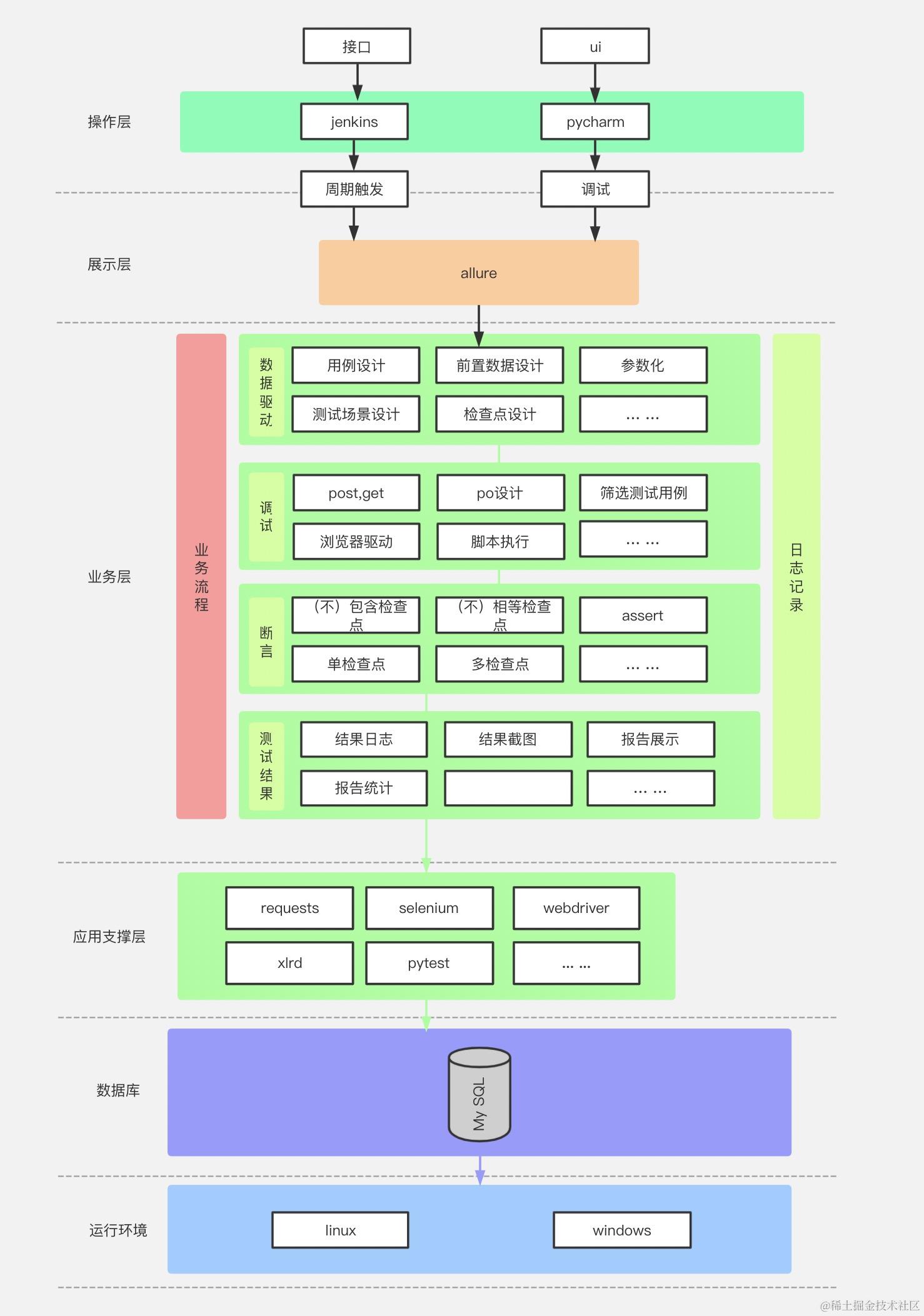 自动化测试框架结构图 Meng 2021-12-31 1,501 阅读4分钟 目录 1、接口自动化测试框架设计图 2、接口自动化执行设计图 3、API自动化平台框架设计图 4、UI自动化测试框架设计图 5、接口+UI自动化测试框架设计图 6、Appium移动端自动化测试框架图 7、JMeter接口自动化测试框架图 8、JMeter接口自动化测试框架图2 9、自动化测试框架设计图 10、自动化测试脚本执行流程 11、自动化测试流程设计图 12、自动化持续集成设计图 13、CICD自动化部署设计图 14、DevOps落地实践 1、接口自动化测试框架设计图 2、接口自动化执行设计图 3、API自动化平台框架设计图 4、UI自动化测试框架设计图 5、接口+UI自动化测试框架设计图 6、Appium移动端自动化测试框架图 7、JMeter接口自动化测试框架图 8、JMeter接口自动化测试框架图2 9、自动化测试框架设计图 10、自动化测试脚本执行流程 11、自动化测试流程设计图 12、自动化持续集成设计图 13、CICD自动化部署设计图 14、DevOps落地实践