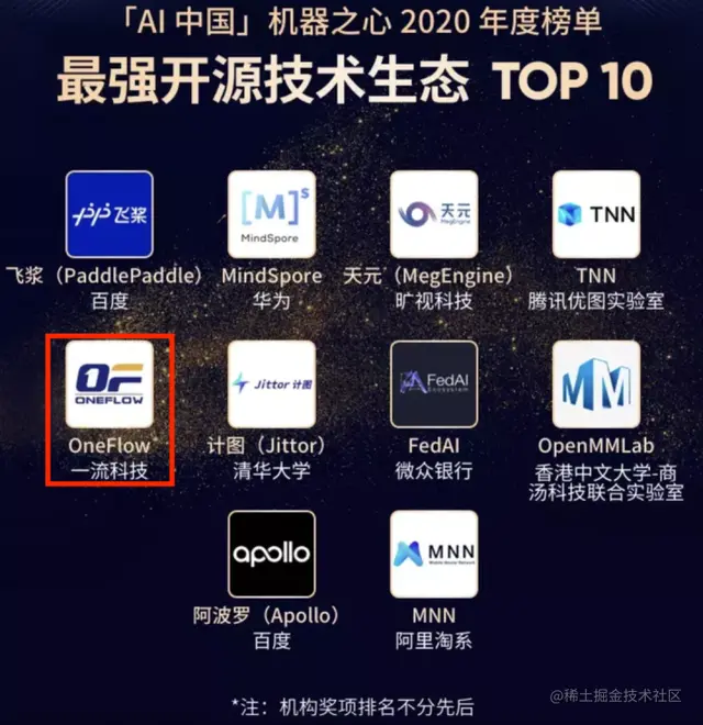 1月15日,OneFlow在2020-2021「AI中国」机器之心年度评选中摘得“最强开源技术生态 TOP10”、“最具商业价值解决方案TOP30”、“最具产业价值技术应用落地案例 TOP30”三项大奖,这说明OneFlow不仅在开源生态中受到开发者的认可,也具备了把产品和应用结合起来赋能更多企业技术落地的能力。