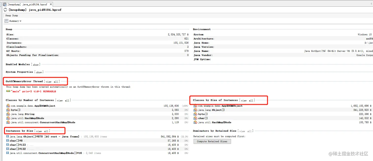 JProfiler,这一款是商用软件,应该不赖,但是作为学习之用就不推荐了,毕竟还是要钱的。Eclipse Memory Analizer,这是一款开源的内存分析工具,但是由于生成的快照文件比较大(3.23G),用这个工具根本打不开,哪怕调整了启动参数也不行,放弃。VisualVM,如果用的是JDK8,自带了这款分析工具;如果是JDK9及其以上,需要单独下载使用。 因为我是通过JDK9生成的内存快照,故单独下载安装了VisualVM,进行内存快照的分析。通过Summary,可以看到几个需要着重关键的点: