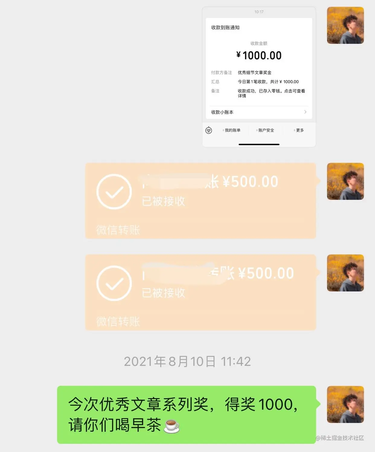 当然奖不奖的也还好,主要有 1000 块钱的奖金还是挺香的,后来请家里人喝早茶去了~