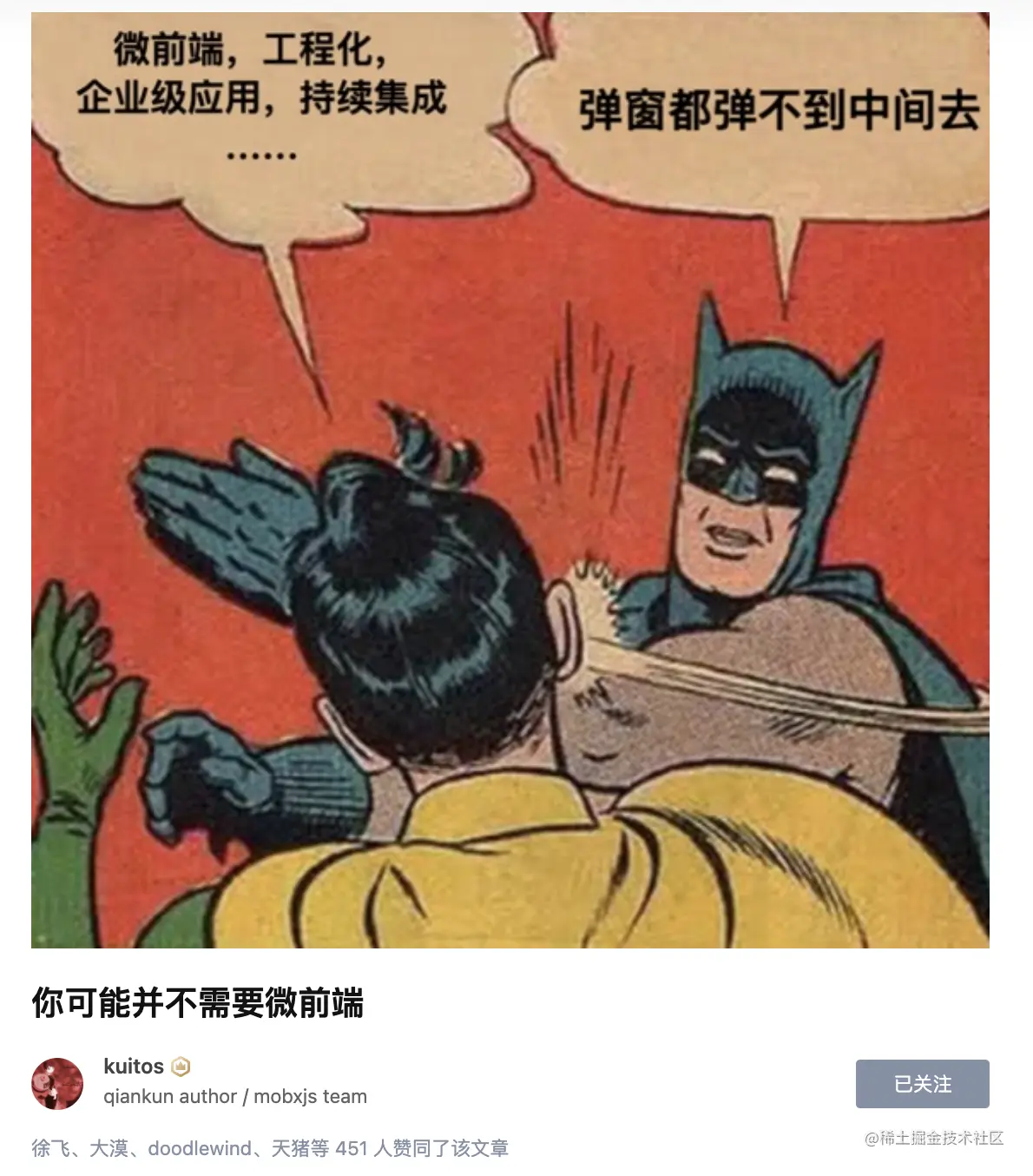 当然也有非常棒的文章,比如 qiankun 作者 kuitos 写的对微前端这个领域思考的文章:
