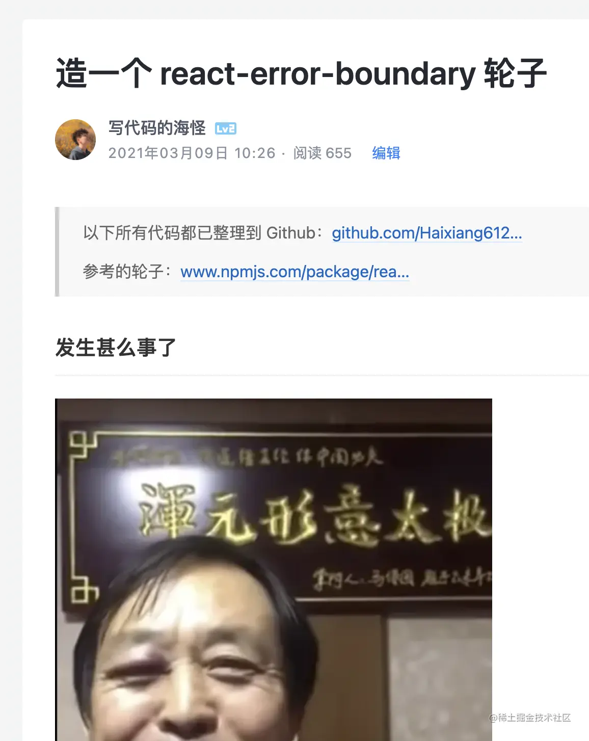 今年算是重新把写文章这件事捡了起来。起因是有一天,我突发奇想:要是把 “马老师不讲武德” + React Error Boundary 结合起来写一篇搞笑的造轮子文章,应该会很有趣。所以就有了这一篇:造一个 react-error-boundary 轮子。