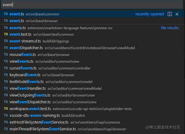 一般来说,说到事件,肯定是跟event关键字相关,因此我们直接全局搜一下文件名(VS Code 下快捷键ctrl+p):