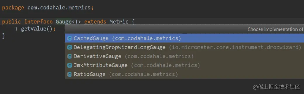 Gauge是对一项值的瞬时度量。我们可以通过实现Gauge接口来根据业务场景自定义度量。