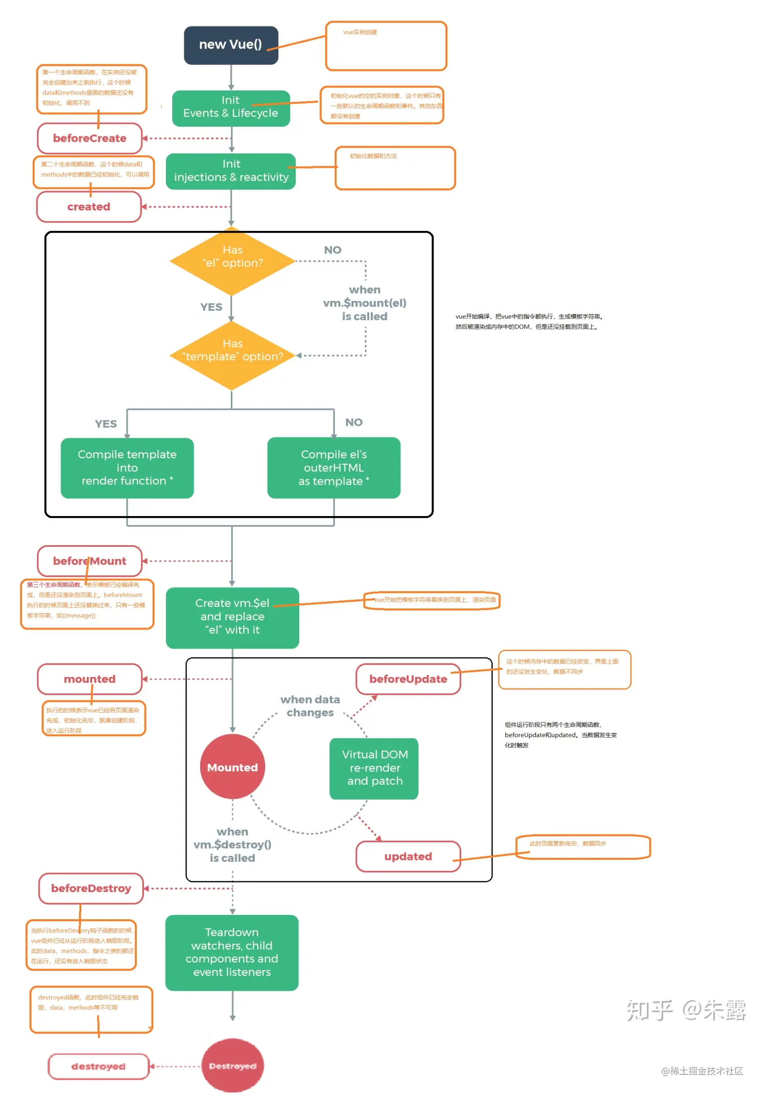 从上图可以很明显的看出现在vue2.0都包括了哪些生命周期的函数了,总结一下,对官方文档的那张图简化一下,就得到了这张图。