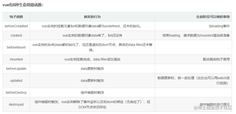- beforeDestroy 销毁之前,this仍能获取到实例,还可以用data、methods等。这个钩子函数一般做事件的移除、清空定时器