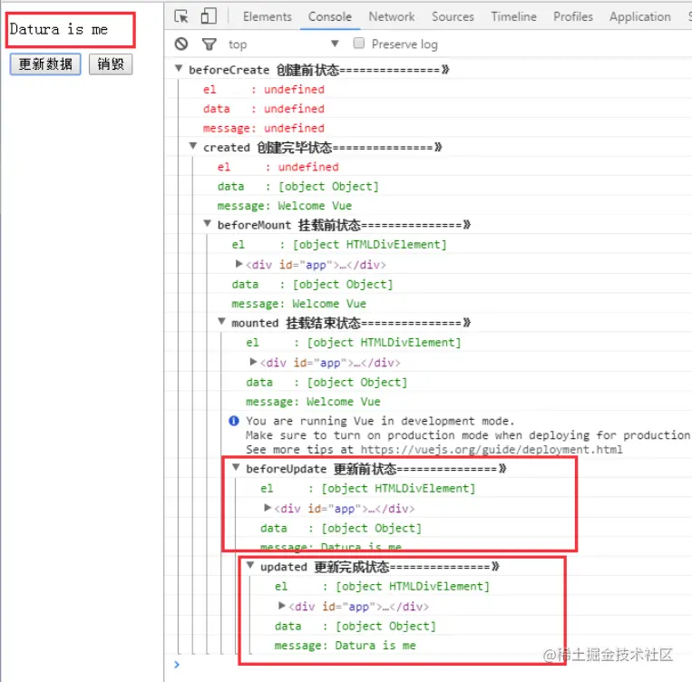 我们单击页面中的“更新数据”按钮,将数据更新。下面就能看到data里的值被修改后,将会触发update的操作。