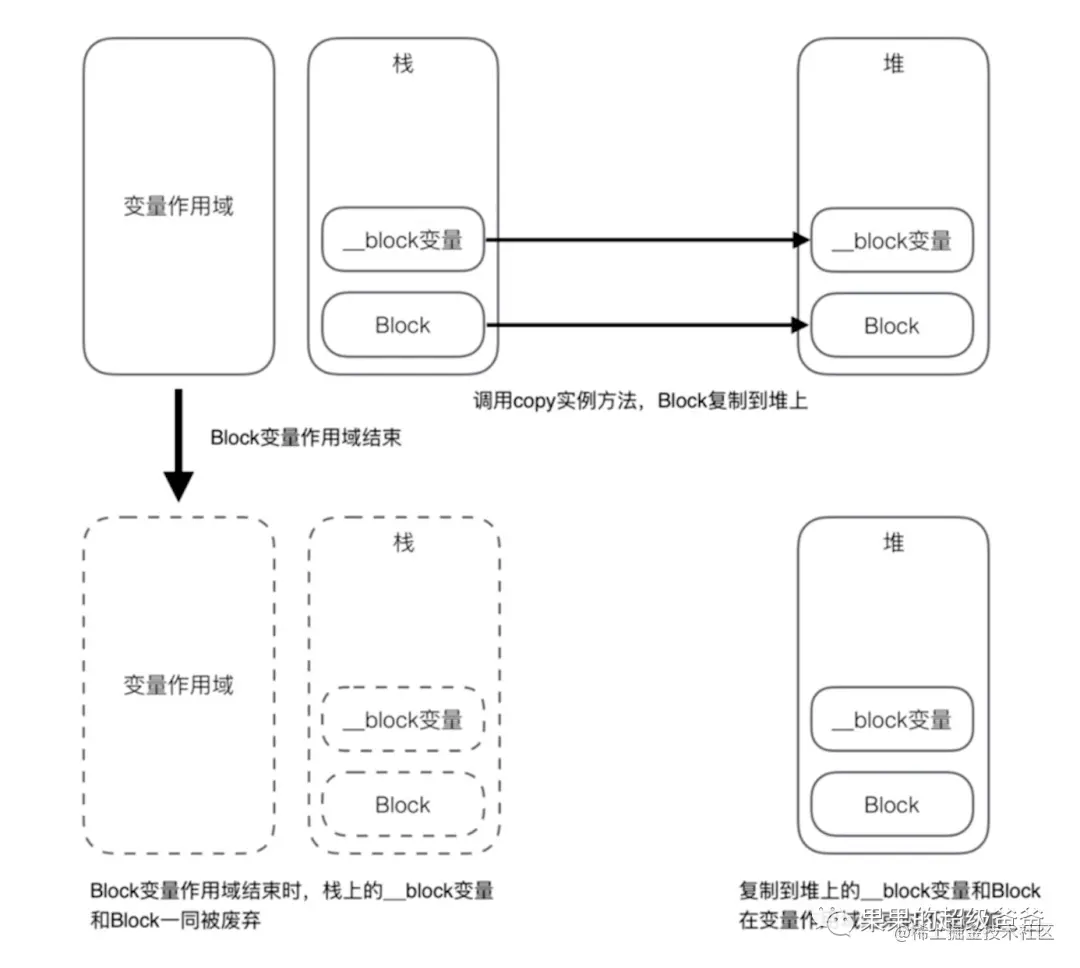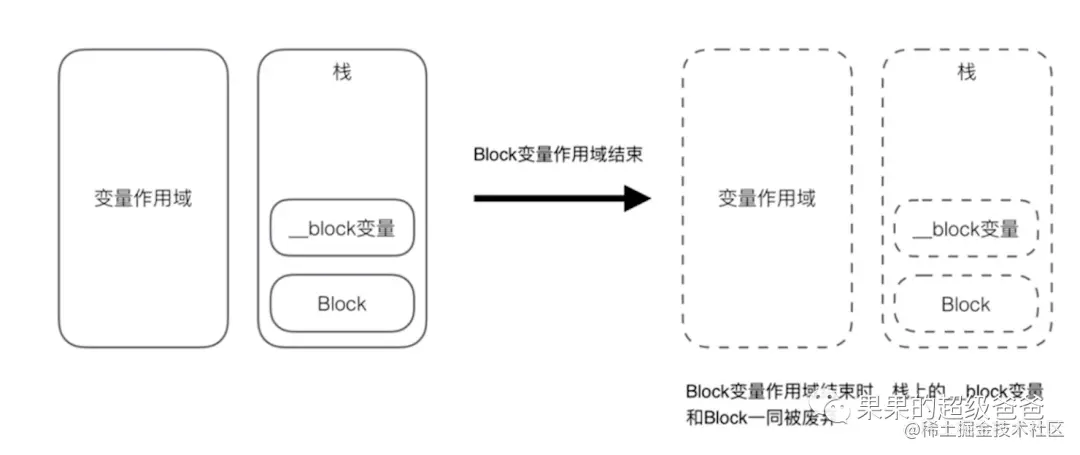 栈上的Blcok,如果其所属的变量作用域结束,该Block就被废弃,如同一般的自动变量,Block中的__block变量也同时被废弃,如下图