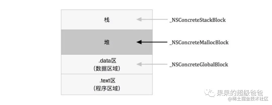 _NSConcreteMallocBlock) 三种block各自的存储域如下图 - 全局快存在于全局内存中,相当于单例