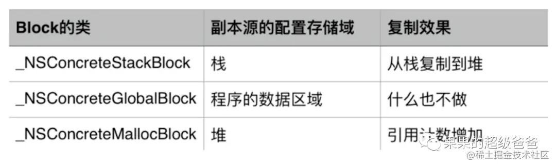 Block的复制操作执行的是copy实例方法。不同类型的Block使用copy方法的效果如下