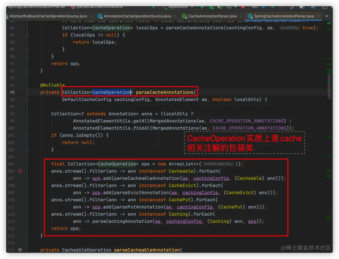 一路跟进去,当我们看到SpringCacheAnnotationParser类的parseCacheAnnotations方法时,就到看了spring把cache的相关注解进行解析,并把注解包装为CacheOperation类