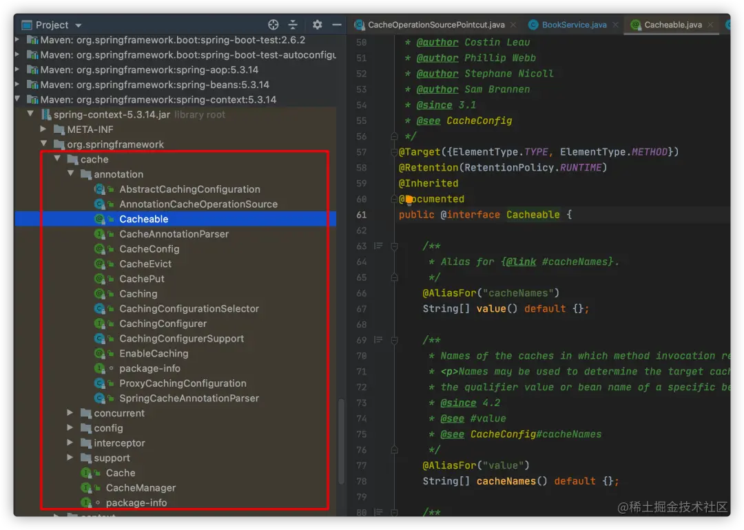 Spring Cache通过注解,并借助Spring AOP实现缓存。打开源码包,定位到我们的@Cacheable注解位置:
