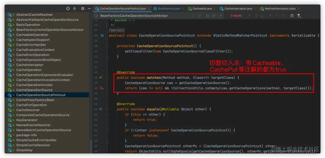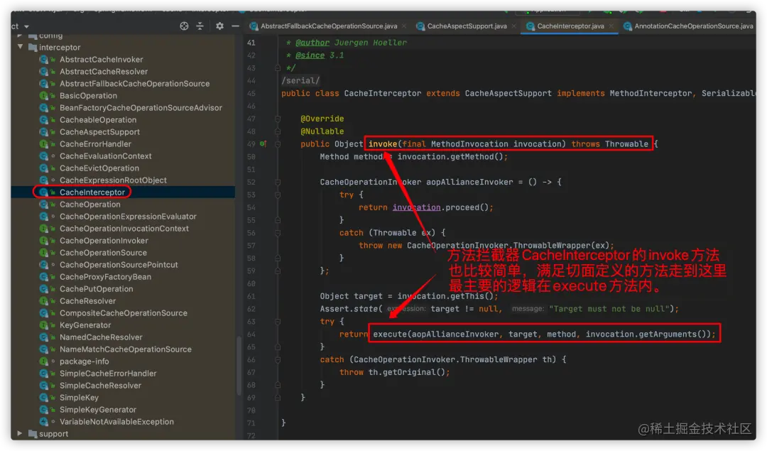 这里再多说一下,看完cache的切入点代码,我们也很容易找到方法拦截器:
