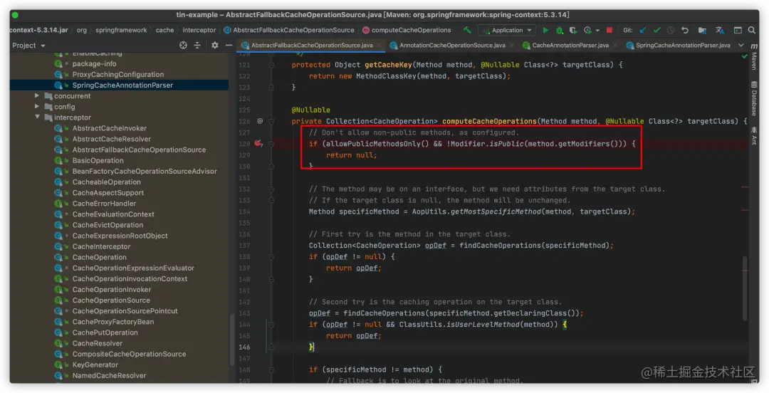 然后,到这里我想重点说一下的是,spring cache已经做了判断,不支持非public方法上的缓存注解,逻辑在哪里呢?细心的可以发现: