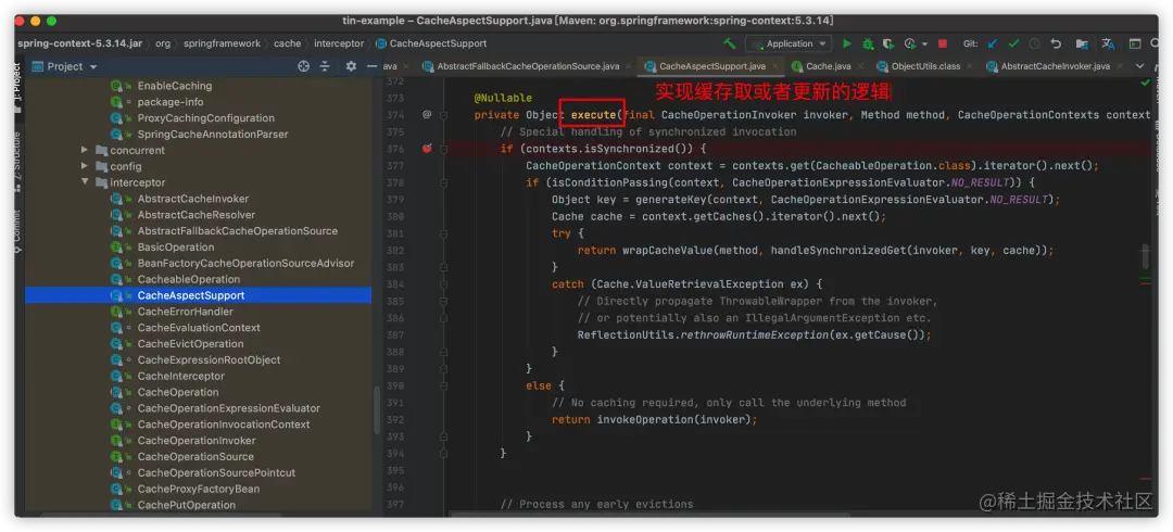 我们从execute方法一路跟进去,可以看到最后是在CacheAspectSupport类的execute方法实现对接缓存的读取或者更新。