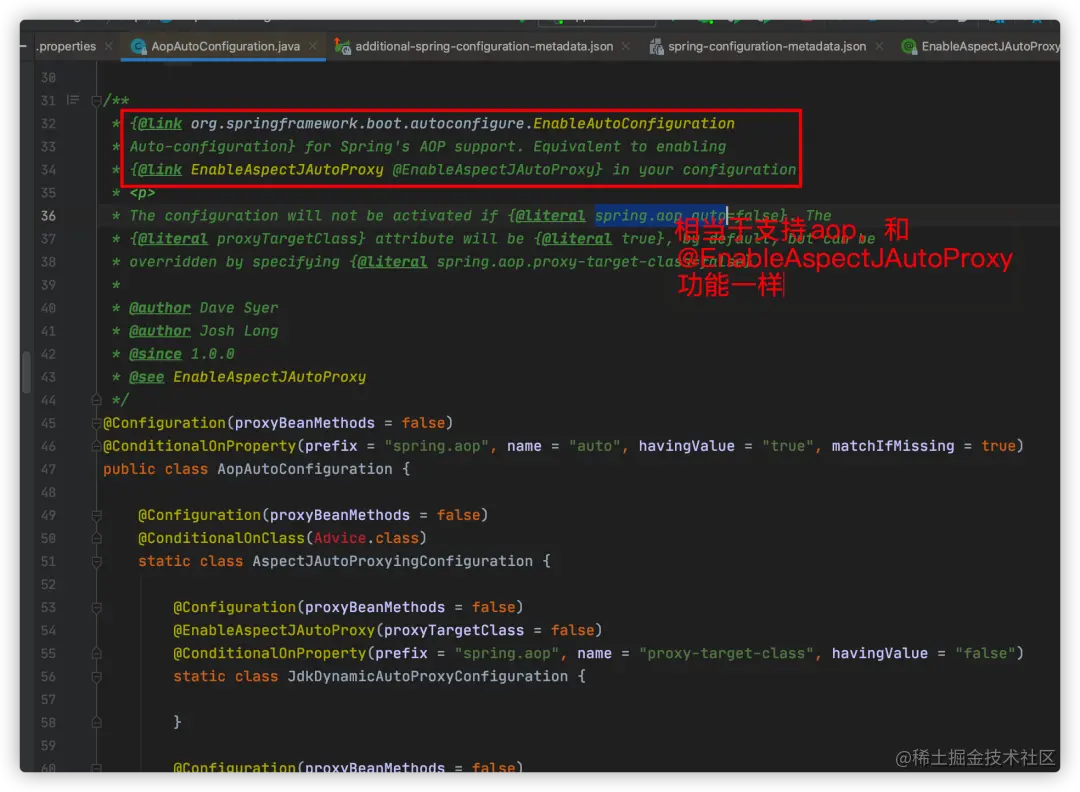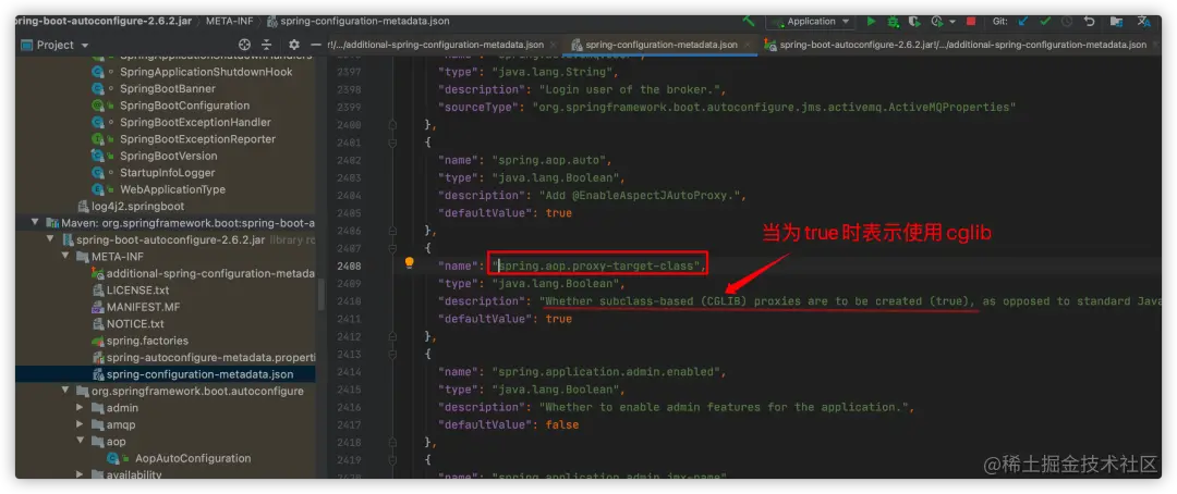 该类启用的条件是:配置参数spring.aop.auto值不为false,我们的spring-configuration-metadata.json中有配置:
